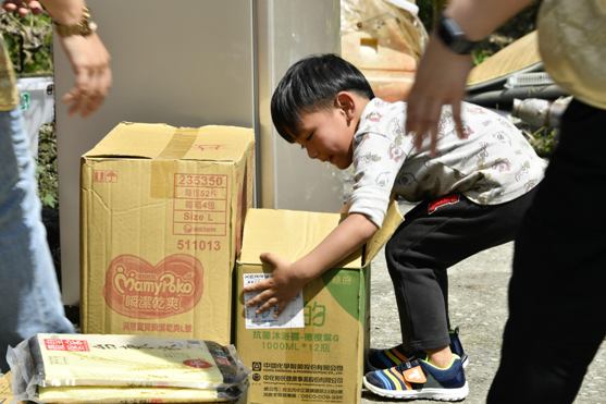 ▲案家小朋友開心穿著協會送的新鞋,迫不及待想幫忙搬運協會所致贈的物資。