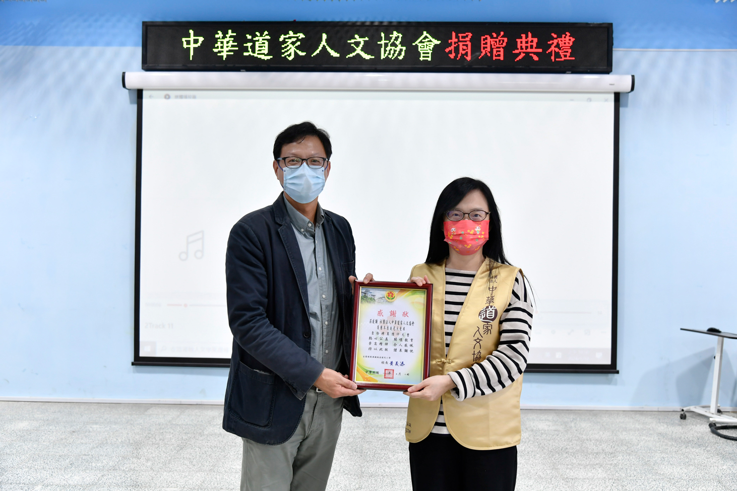 ▲宜蘭縣政府也頒發感謝狀表揚協會對梗枋國小的捐資興學,由張志弘校長(左)代表致贈給張旖理事長(右)
