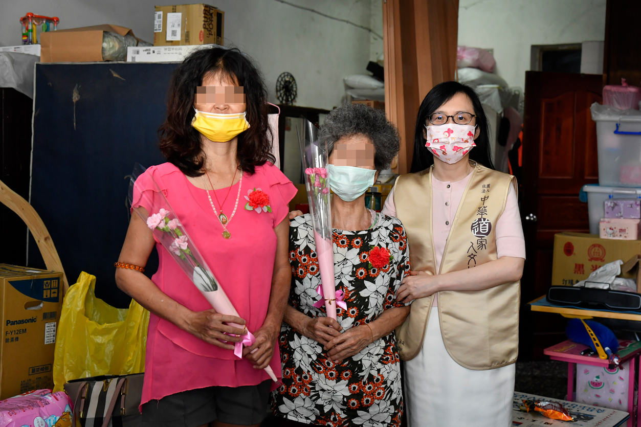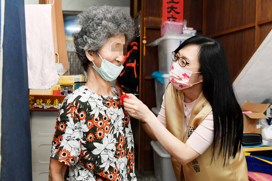 ▲協會張旖理事長(右)訪視關懷家戶,親手為家戶媽媽別上康乃馨,獻上真摯的祝福。
